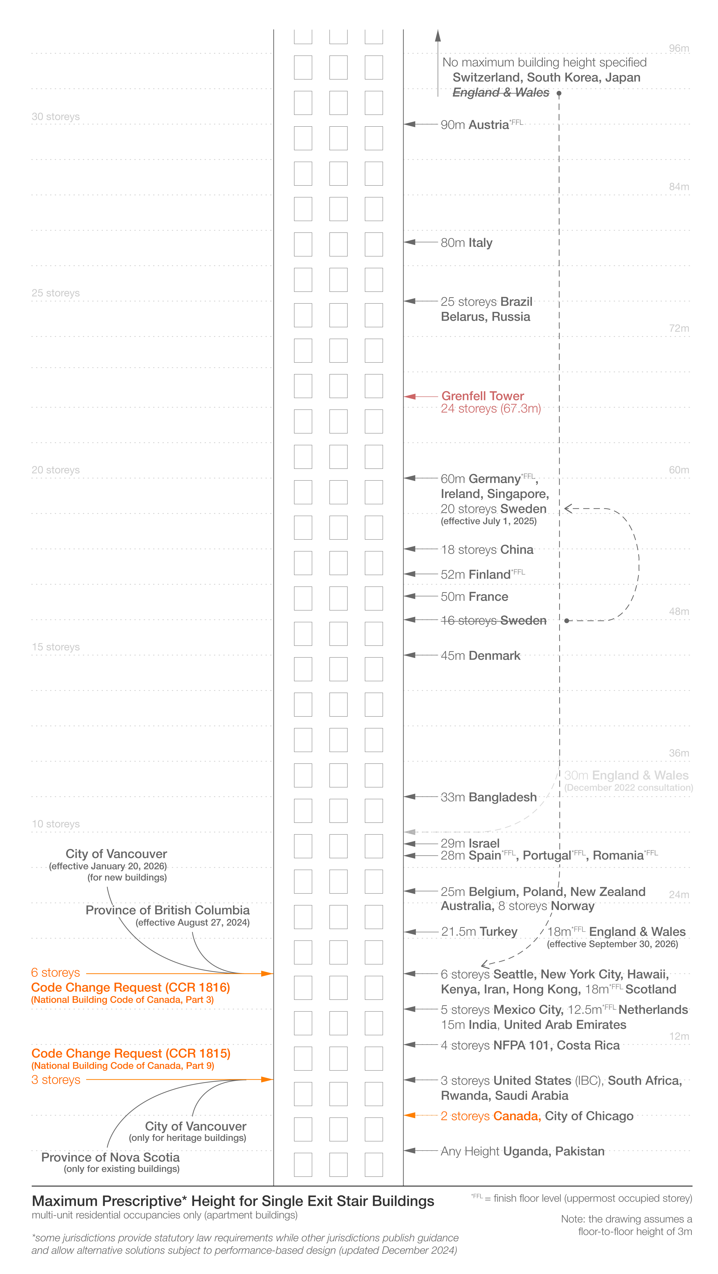 Speckert, C. (2022). Jurisdictions: Maximum Permitted Height for Single Stair Buildings [Infographic]. McGill School of Architecture. Updated in December 2025. Retrieved from https://secondegress.ca/Jurisdictions